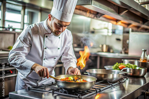 kitchen, cooking, chef, food, cook, eatery, home, woman, preparing, people, preparation, smiling, dinner, meal, work, stove, person, indoor, uniform, pan, man, standing, apron, professional, prepare