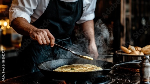 chef, cooking, omelet, frying, pan, steam, kitchen, food, cook, preparing, meal, man, holding, spatula, eatery, professional, uniform, apron, indoor, culinary, expertise, male, person, hand, frying pan, omelet, hot, cookware, preparation, dark, commercial, stirring, ingredient, cookery, kitchen utensile, equipment, skill, receipe, dining, lunch