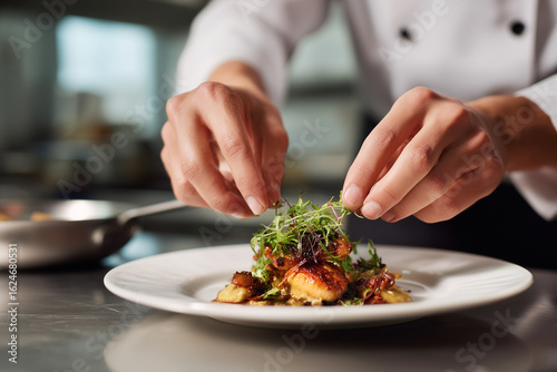 Chef Garnishing a Gourmet Dish with Fresh Microgreens in a Professional Kitchen Setting