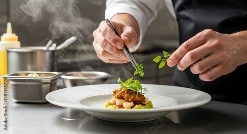 Chef Garnishing Gourmet Dish in Steamy Kitchen – Precision and Culinary Artistry