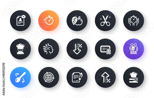 Chef hat, Customer survey, Approved application icons. Scissors cutting, Certificate icons. Interest rate, gluten free. Classic set. Circle web buttons. Vector