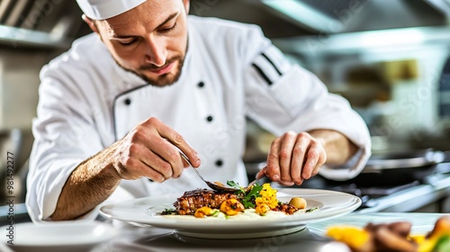 chef in a well-equipped kitchen arranging microgreens on a plated dish with precision, copy space
