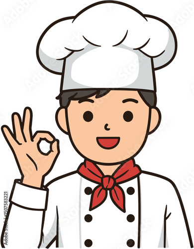 chef, cooking, smiling, uniform, hat, gesture, kitchen, food, professional, happy, male, cook, eatery, wearing, apron, red, foulard, cartoon, cartoonist, authority, culinary, expression, character, profession, satisfaction, thumb up, style, cheerful, animation, cookery, hospitality, nourishment, occupation, interaction, service, dish, meal, indication, positive, approval, traditional, engagement, personality, identity