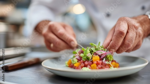 chef, plating, epicure, food, dish, eatery, kitchen, hotel, culinary, cooking, meal, preparation, cookery, presentation, garnish, hand, professional, skill, care, detail, fine, dining, service, hospitality, healthy, fresh, ingredient, colours, delicious, gastronomy, salmon, tuna, meat, vegetable, herb, plate, luxury, work, job, men at work, occupation, career