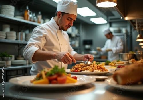 Chef preparing gourmet dishes in a busy kitchen during dinner service