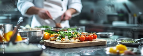 Chef preparing healthy gourmet chicken salad with cherry tomatoes in restaurant kitchen