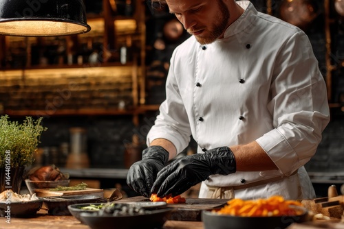 Chef Wearing Gloves Prepares Ingredients in Kitchen for Dish. Caucasian Male Cook in White Uniform at Wooden Table