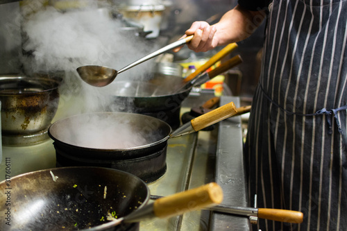 Chefs at work in a commercial kitchen. Male chef cooking using wok styled pans in a takeaway / restaurant setting