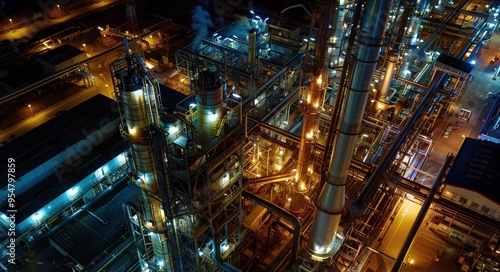 Chemical Plant. Aerial View of Petrochemical Refinery Construction at Night for Fuel and Energy Business