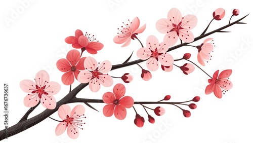 Cherry blossom branch with pink and red flowers on white background – Spring renewal, Japanese symbolism, floral elegance, minimalist nature art, seasonal bloom, delicate composition