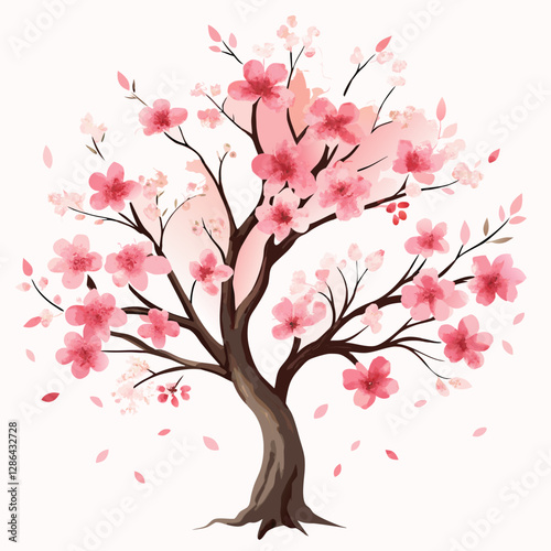 Cherry Blossom Tree in Watercolor Painting with Delicate Pink Flowers and Gentle Breeze Effect