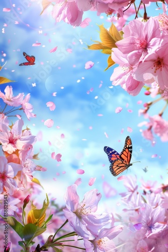 cherry, blossom, butterfly, flower, pink, blue, sky, tree branch, spring, nature, bloom, season, floral, beautiful, sunlight, background, tree, peaceful, scenic, delicate, vibrant, fresh, serene, pastel, natural, botany, foliage, skyward, calmness