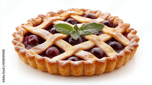 Cherry Pie with Holiday Garnish on White Background: A Classic Lattice Crust Cherry Pie with Festive Garnishes of Mint and Powdered Sugar for Perfect Holiday and Food Photography