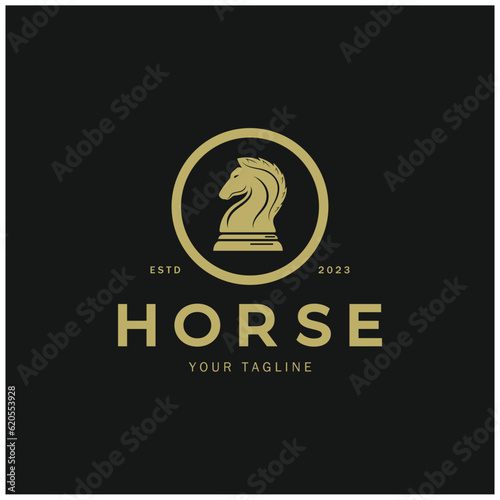 Chess strategy game logo with horse, king, pawn, minister and rook. Logo for chess tournament, chess team, chess championship, chess game application.