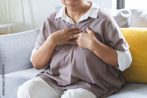 Chest pain, attack chest, emergency heartbeat asian senior woman holding hand on chest, suffering symptom from pain, heart disease problem of aged anxiety cardiac. Health care of cardiology concept.