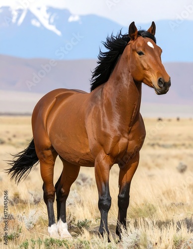 horse, chestnut, equine, mammal, animal, field, mountain, landscape, nature, wildlife, majestic, strong, powerful, beautiful, serene, proud, wild, freedom, brown
