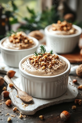 Chia seed mousse in a white ceramic dish artfully presented with crushed nuts