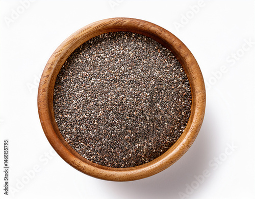 chia seeds in a wooden bowl top view isolated in a pure white background cutout
