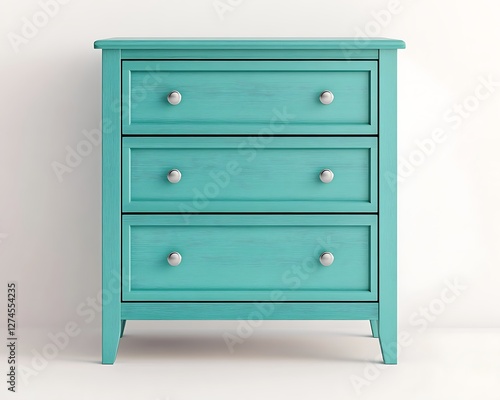 Chic teal storage cabinet with three drawers, front view, isolated on pristine white backdrop, high resolution,