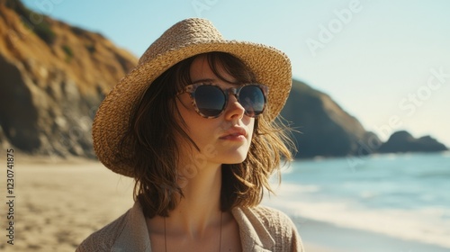 fashionable, summer, clothing, beach, attire, sunglasses, straw, hat, vacation, style, coastal, lifestyle, travel, photo, activity, tour tourism, leisure, time, landscape, rocky, shoreline, sea, breeze, ocean, view, beachwear, casual attire, adventure, summer, sun, protection, essential, sandal, walk