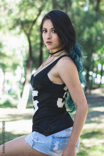 Chica rock en naturaleza con shorts de mezclilla jeans top negro, cabello ombré, linda sexy