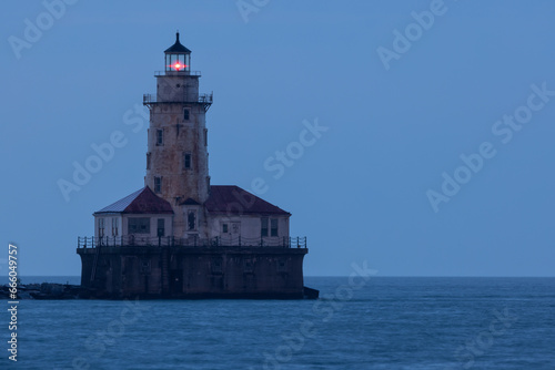 lighthouse, light, beacon, tower, breakwater, navigation, guidance, nautical, maritime, historic, landmark, architecture, lit, lighted, great lake, lake, lake michigan, offshore, evening, night, dark, rain, raining, wet, seascape, water, ocean, sea, sky, aid, safety, marker, building, harbor, history, travel, tour tourism, vintage, antique, obsolete, red, white, chicago, illinois