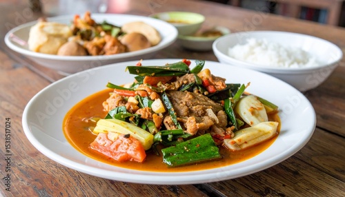 food, meal, dish, meat, plate, dinner, cookery, chicken, vegetable, pork meat, salad, lunch, delicious, thai, epicure, sauce, rice, white, healthy, fried, pepper, vegetable, curry, seafood, eatery