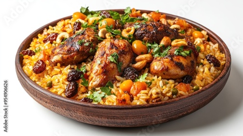 chicken, rice, dish, cashew, dried, fruit, parsley, nut, brown, wooden, bowl, plate, white, background, food, cookery, delicious, savoury, meal, dinner, lunch, healthy, epicure, flavorful, fragrant, aromatic, texture, fresh, garnish, yellow, orange, green, appetising, eatery, home, cooked, tasty, spice, sweet, kitchen, traditional, round, middle, festive, macro, sour, indian, composition
