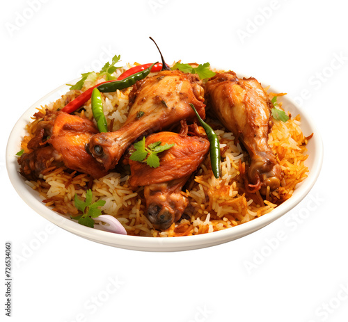 Chicken biryani , kerala style chicken dhum biriyani made using jeera rice and spices arranged in a white ceramic png background, isolated
