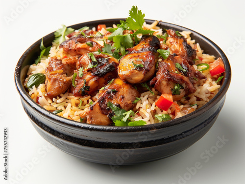 Chicken biryani isolated on white background. Cooked with selected spices with a traditional recipe.