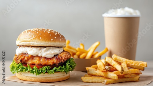 Chicken Burger Meal with Fries and Drink chicken burger fast food french fries takeaway meal lettuce
