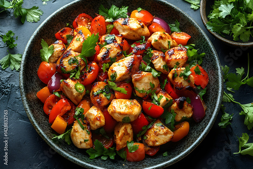 food, chicken, meat, meal, dinner, vegetable, pan, cooking, dish, vegetable, pepper, healthy, cookery, lunch, fried, plate, fresh, green, rice, onion, hot, roasted, cooked, white, red