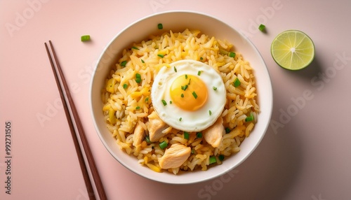 Chicken fried rice with egg on top served in a white bowl with chopsticks