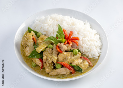 Chicken green curry with coconut shoots over rice isolated on white background.