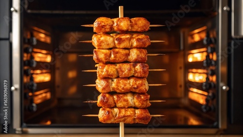 Chicken kebab skewers cooking in the oven, a delicious and flavorful dish prepared with wooden sticks for a gourmet meal