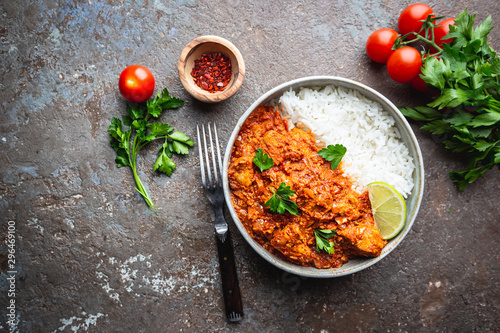 Chicken meat with tikka masala sauce, spicy curry food in a bowl with rice and seasonings, top view