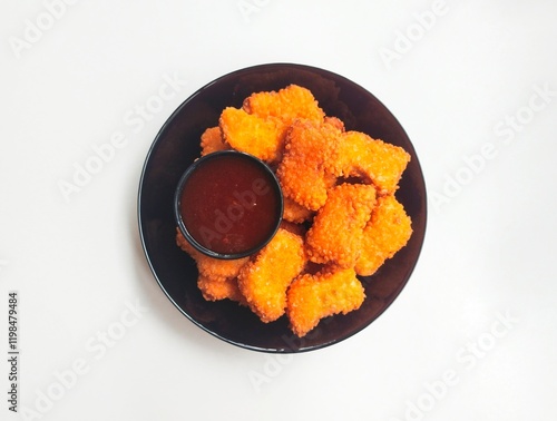 chicken, nugget, nugget, black, plate, sauce, bowl, background, white, top, view, food, meal, cookery, cooking, cooked, lifestyle, culinary, menu, eatery, deliciously, epicure, junk food, junk, crunchy, crisp, crispy, fried, delicious, taste, tasty, eating, eat, diet, dieting, nourishment, calorie, fat, spicey, spice, dinner, meat, lunch, closeup, cook, ketchup, dish