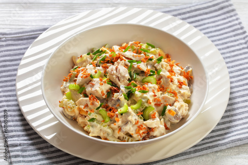 cheddar, american, fillet, dish, table, eat, turkey, hot, salad, up high, delicious, topped, cooked, breast, meal, cheese, white, leftover, bowl, cubed, ingredient, creamy, sour cream, french, celery, meat, topview, closeup, dinner, mushroom, chicken, mayo