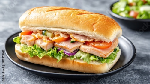 Chicken sandwich with veggies on plate, served with salad, food concept, yummy lunch