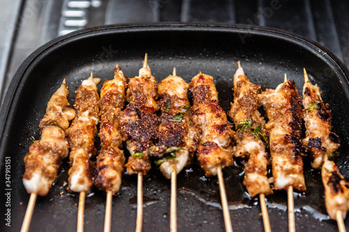 Chicken skewers or meat on the grill Indonesian food satay