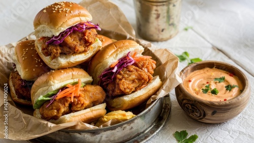 Chicken sliders with crunchy slaw and dipping sauce on rustic tray