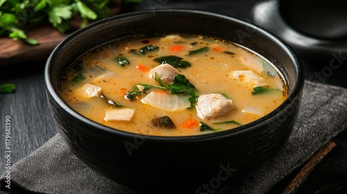 soup, food, bowl, meal, vegetable, dinner, dish, healthy, chicken, hot, cookery, lunch, white, epicure, meat, rice, broth, delicious, plate, parsley, fresh, spoon, green, onion