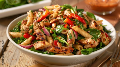 chicken, spinach, pasta, salad, penne, grilled, red, onion, pine, nut, white, bowl, wooden, table, fork, spoon, healthy, meal, lunch, dinner, food, receipe, cooking, eat, delicious, tasty, fresh, summer, side, dish, main, course, easy, quick, simple, homemade, eatery, styling, culinary, cookery, italian, mediterranean, vegetarian, vegan, gluten, dairy, protein, carbohydrate, fiber