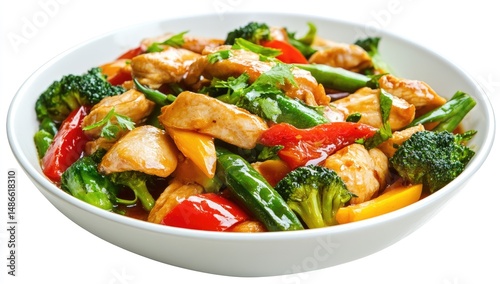 chicken, stir fry, vegetable, broccoli, pepper, green beans, asian, food, dish, bowl, white, plate, meal, cookery, healthy, protein, dinner, lunch, tasty, savoury, flavorful, cooked, deliciously, delicious, colourful, alimentary, bright, appetising, hot, saucy, serving, eatery, fresh, ready, eat, ingredient, portion