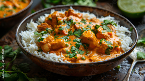 Chicken Tikka Masala. Traditional Indian curry with rice meal.