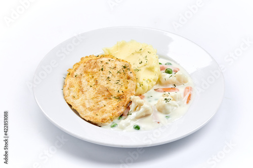 food, meal, salad, white background, plate, sauce, nutrient, traditional, lunch, menu, portion, fresh, chicken, meat, steak, cream, vegetable, carrot, cucumber, fried, breast, protein, epicure, isolated, russian