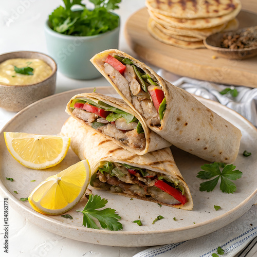 food, meal, enclosed, chicken, meat, tortilla, bread, salad, fish, tomatoes, dinner, sandwich, plate, lunch, snack, cheese, fresh, vegetable, grilled, healthy, cookery, lettuce, burrito, epicure, dish