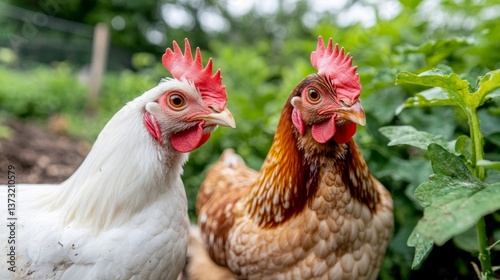 Chickens foraging in a lush green garden during a sunny afternoon in a rural setting with vibrant foliage