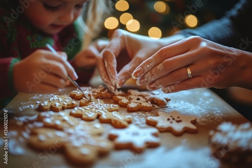 Child and Adult Baking Together with Gingerbread Cookies and Holiday Decorations