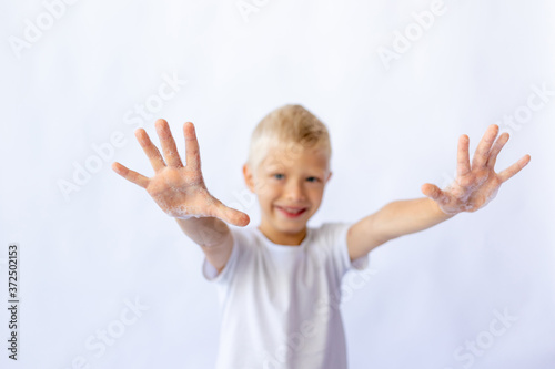 child boy in a white t-shirt shows hands in foam on a white isolated background, hands in focus. World hand washing day